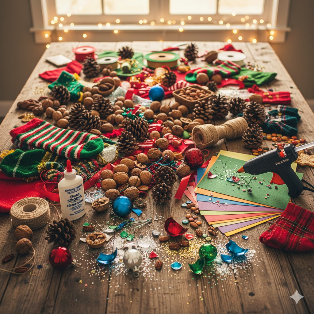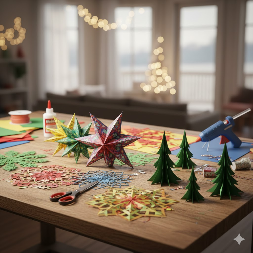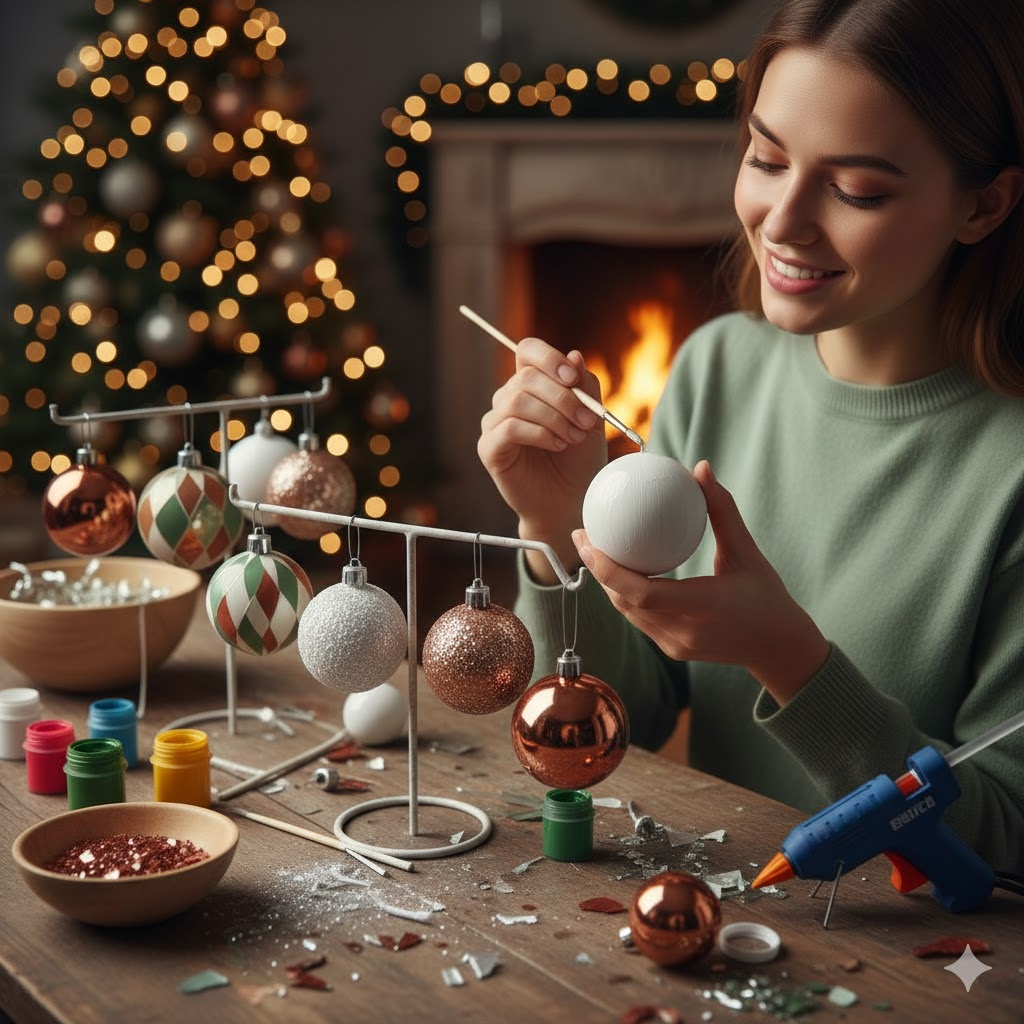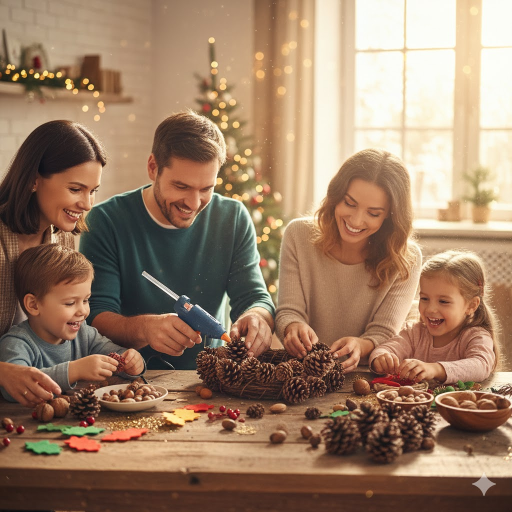 Çam süsleri, kar taneleri, çelenkler, ışık zincirleri, kar figürleri, kokulu asmalar veya mini kompozisyonlar yapabilirsiniz — evde sıcaklık ve kutlama ruhu katacak her şey.